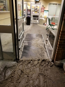 Many grocery and supermarkets have routine observation of their aisles for leakage and dropped food products, they even inspect their restrooms on a regular basis. One of the things that managers need to be aware of is that the entrance to their stores can be very dangerous if the doors are not inspected at least on a daily basis. When there is inclement weather and there are wet, snowy and dirty areas leading up to the entrance, it is important that the store management check those areas regularly and keep those areas clean to protect their patrons from slipping or tripping, and falling. Here is an example of a store that is negligent. They managed to melt the snow outside so customers would not slip, but they forgot to clean up the mess and patrons were having to walk through this to enter the store. This is a personal injury lawsuit waiting to happen and the store manager is neglectful not keeping the entrance safe to visitors.